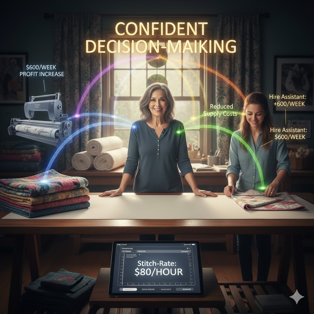 If you are guessing, these decisions are terrifying. If you have a snapshot, they are simple math. If your data shows that you are spending 10 hours a week trimming quilts and your Stitch-Rate on the frame is $80/hour, the math tells you that hiring someone to trim for $20/hour will actually make you $600 more a week.